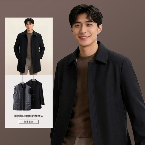 Artsdon/阿仕顿秋冬男士新款翻领商务保暖可脱卸鹅绒内胆羊毛大衣